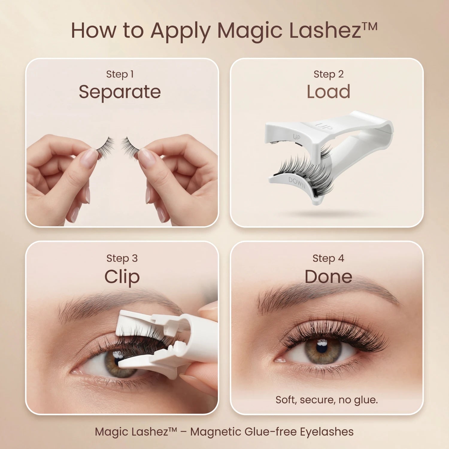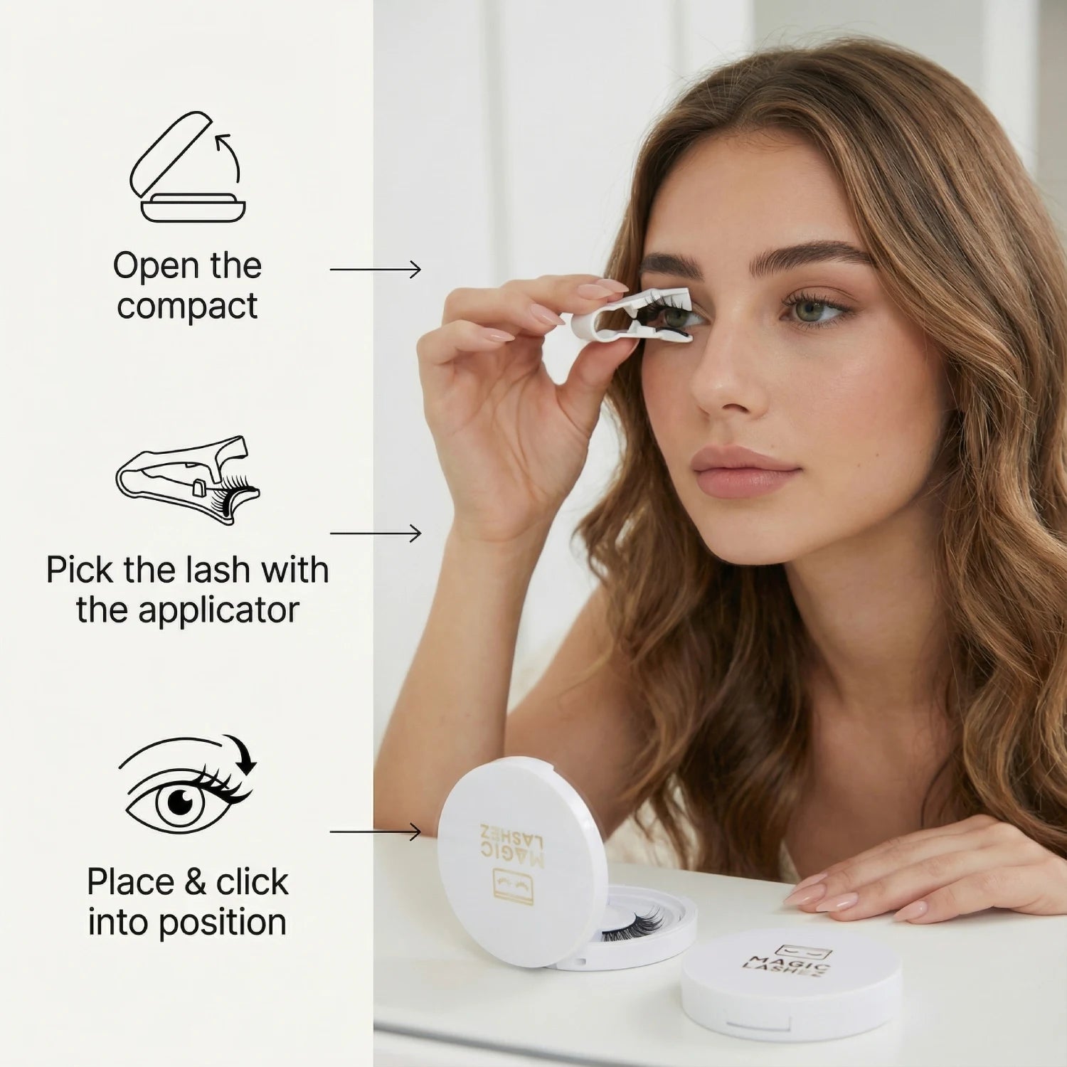 No more glue disasters. Just follow the four steps and let the magnetic applicator do the positioning work. Even if you've never worn false lashes before, you'll get this right — fast.
